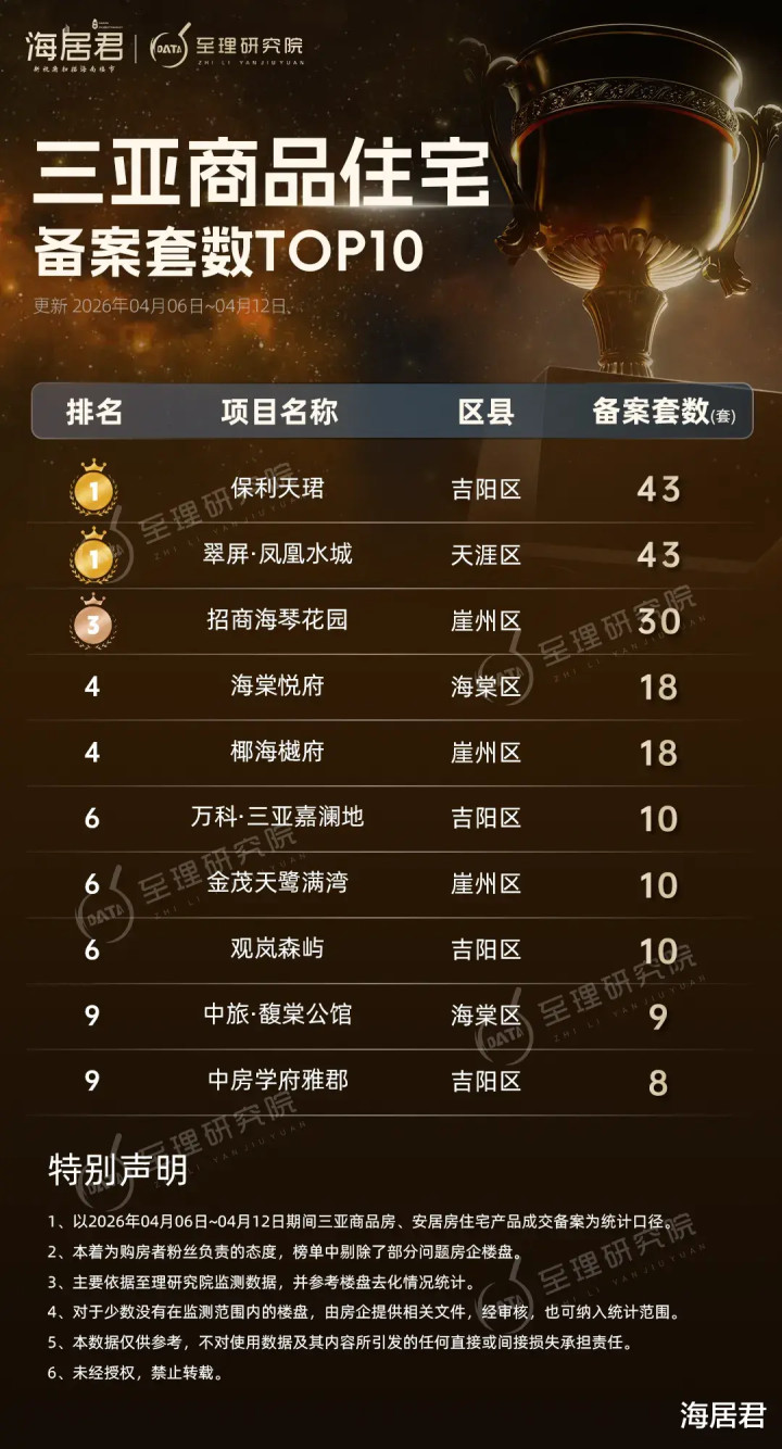 三亚CBD月川单元保利天珺、三亚湾板块翠屏·凤凰水城均成交43套,并列三亚商品房住宅成交套数冠军;前者摘得面积冠军、后者拿下面积亚军。