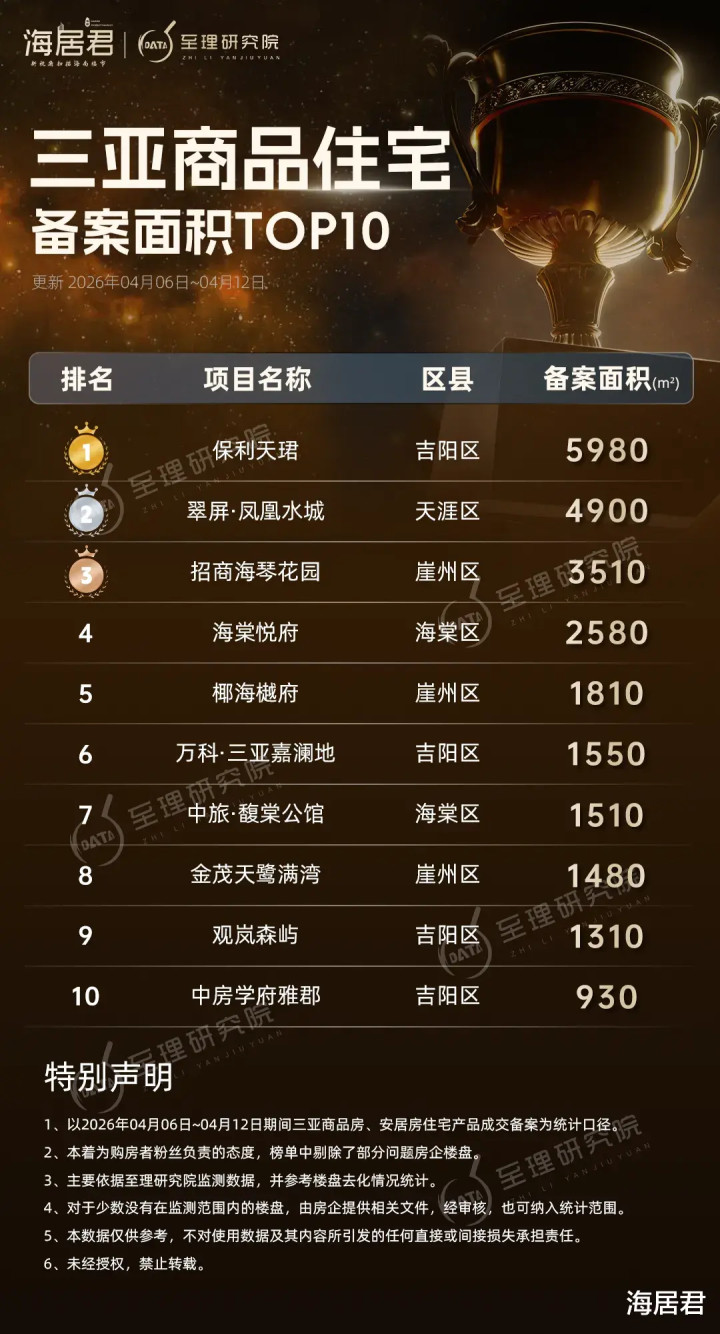 海棠湾海棠悦府、崖州湾椰海樾府均成交18套并列第四;临春片区万科嘉澜地、崖州湾金茂天鹭满湾、海罗片区观岚森屿均成交10套,并列第六。